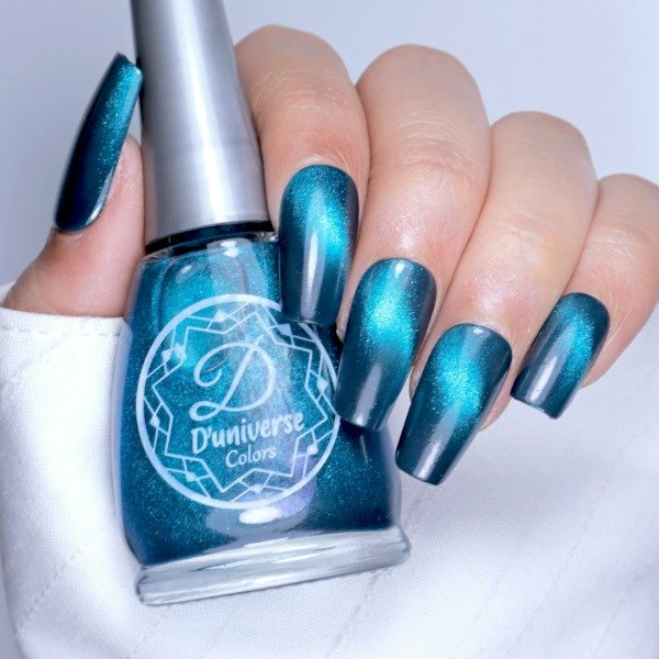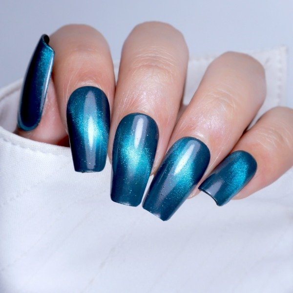 Aplicación: Aplica tu base de preferencia, luego sobre negro o colores fuertes aplica una capa de ojo de gato, mueve las partículas con el imán y déjalo sobre la uña de 30 a 60 segundos hasta que dejen de moverse, luego al aplicar el brillo vuelve a poner el imán unos segundos.