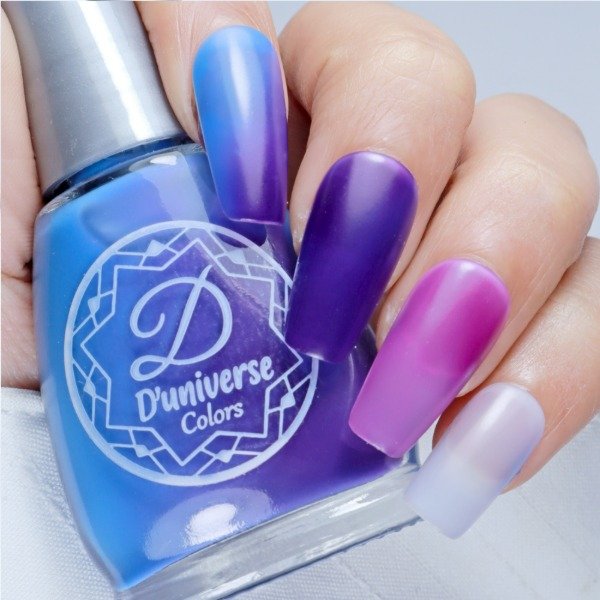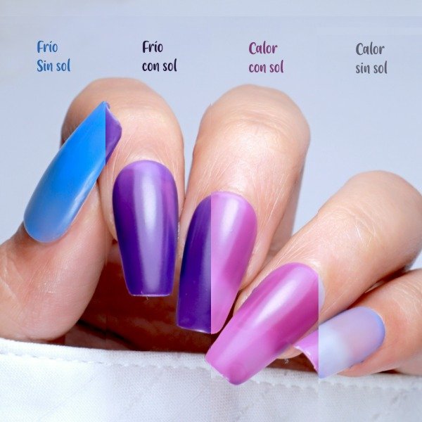 Esmalte que cambia de color con la temperatura corporal o de ambiente y con la luz ultravioleta o el sol, cambia de rosa a violeta, azul, nude y blanco, entre otros. 20 free tradicional de secado al aire, Hecho en Colombia. NO NECESITA LÁMPARA.