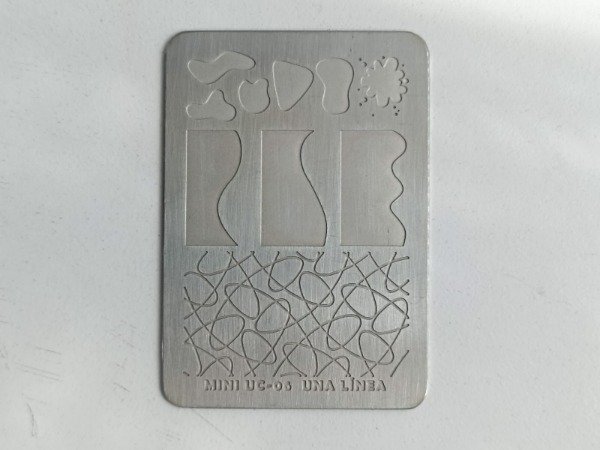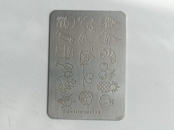 Placa metálica Marca Uñas Coquetas, dos en una (tiene diseños por ambos lados de la placa).