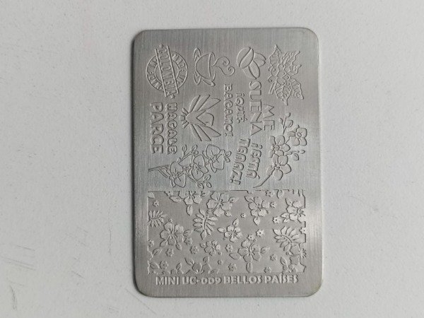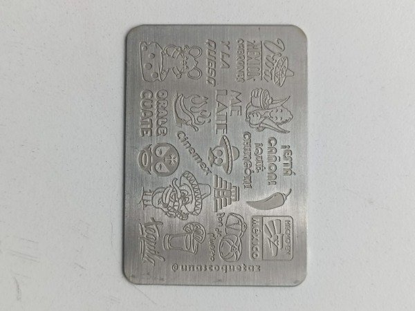 Placa metálica Marca Uñas Coquetas, dos en una (tiene diseños por ambos lados de la placa).