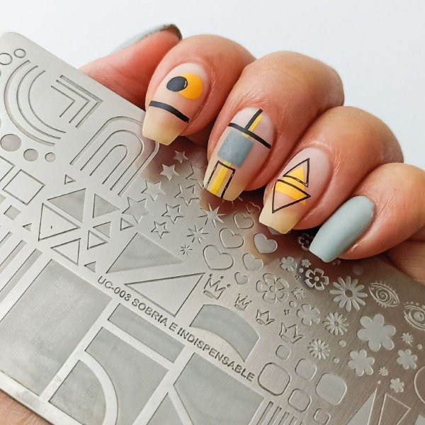 Placa metálica Marca Uñas Coquetas, dos en una (tiene diseños por ambos lados de la placa).