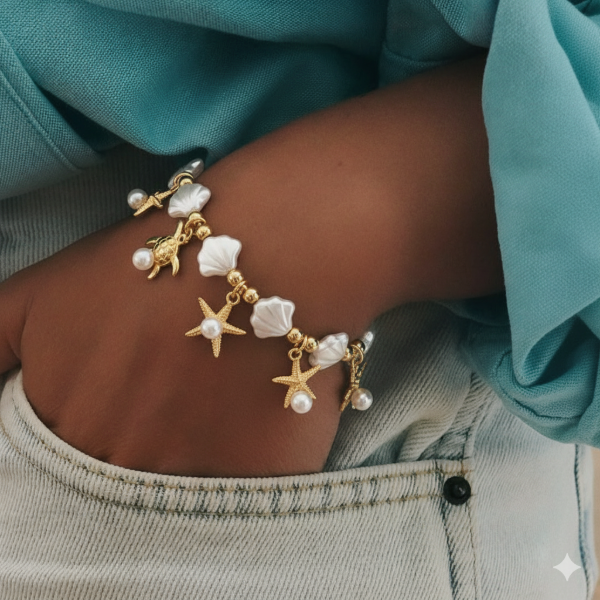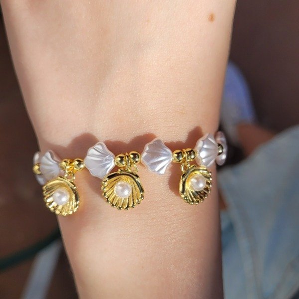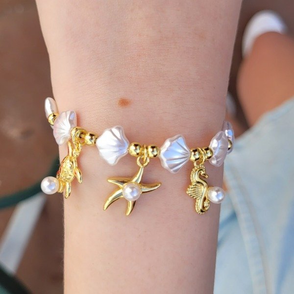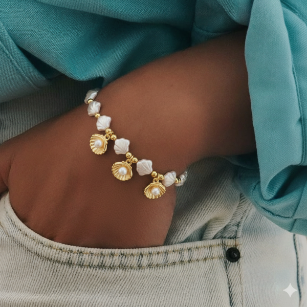 Sumérgete en el encanto del mar con nuestra pulsera "Tesoro Marino". Esta pieza de inspiración costera evoca la magia de la playa y el lujo bajo el sol, combinando el brillo nacarado de las cuentas perladas con el resplandor del metal dorado.